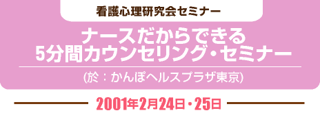 2001.2.24(土)、25(日)の2日間にわたって、看護心理研究会、ヒューマン・グロウス・センター共催による「ナースだからできる5分間カウンセリング・セミナー」が開催されました。