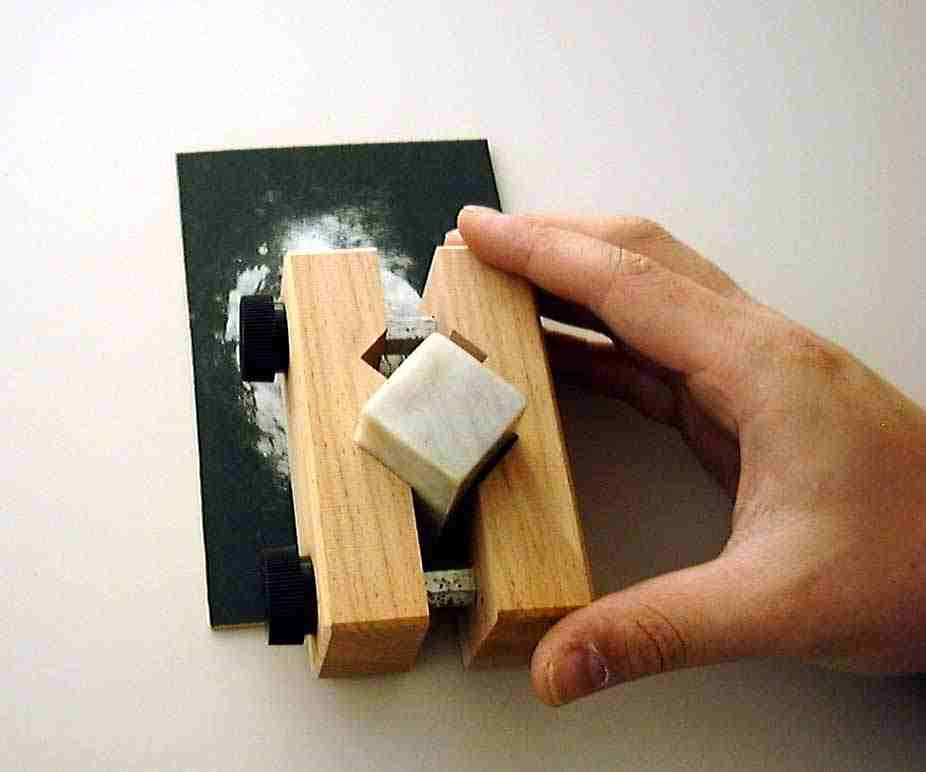 篆刻刀の刃の角を利用して彫っていく ★注意 ↓ この?マークのマジックインキのみ転写可能!