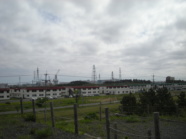 | 始めに再処理工場が見える丘に行きました。右写真の風景です。150mの煙突も見えましたが、正直高いから安全とは思えませんでした。広大な土地の影響か、想像以上に低く見えたので、「近いなぁ・・・怖いなぁ・・・」と感じました。また、道中「核融合」関連の施設が作られますという看板を目にしました。次から次へ建設され続けていると感じました。 |
