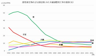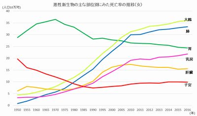 悪性新生物の主な部位別にみた死亡率の推移(平成28年人口動態統計確定数)