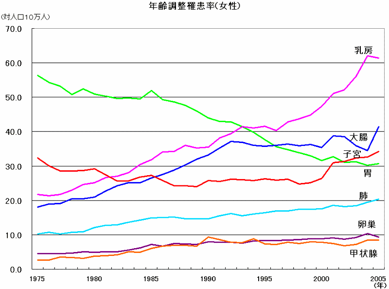 先週ご紹介しました、国立がんセンターがん対策情報センターのがん情報サービスからダウンロードした2005年までのがんの罹患データを元に、主な部位のがんの推定罹患数・罹患率の推移をグラフにしました。 女性 ![]() ※グラフをクリックすると別窓に拡大表示されます。 ![]() ※グラフをクリックすると別窓に拡大表示されます。 ![]() ※グラフをクリックすると別窓に拡大表示されます。 (H22/5/7 池田)