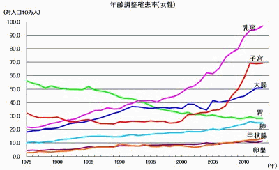 国立がんセンターがん対策情報センターのがん情報サービスからダウンロードした2013年までのがんの罹患データを元に、主な部位のがんの推定罹患数・罹患率の推移をグラフにしました。 女性 ![]() ※グラフをクリックすると別窓に拡大表示されます。 ![]() ※グラフをクリックすると別窓に拡大表示されます。 ![]() ※グラフをクリックすると別窓に拡大表示されます。 (H29/9/29 池田)