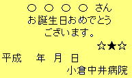 正月 ひな祭り 端午の節句 ・・・・・・・ クリスマス お誕生日カード 入院患者さんの、お誕生日の食事の時に お誕生日カードを お付けしています。