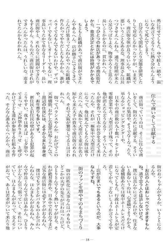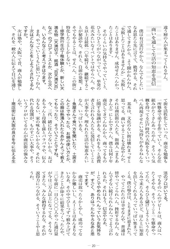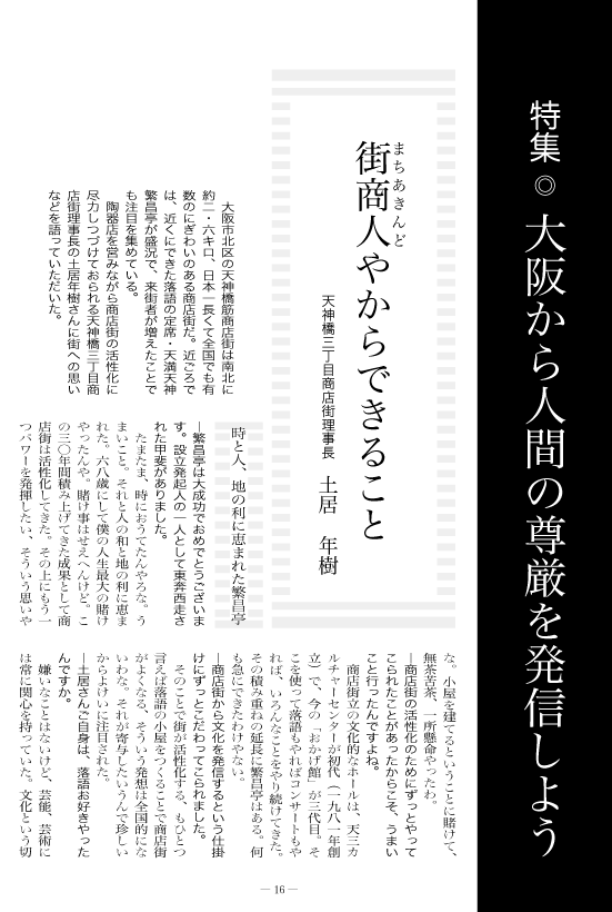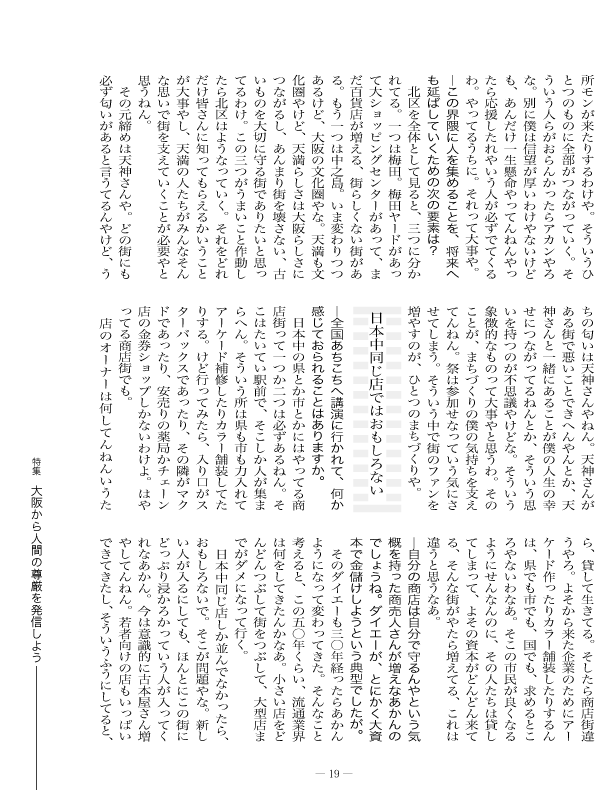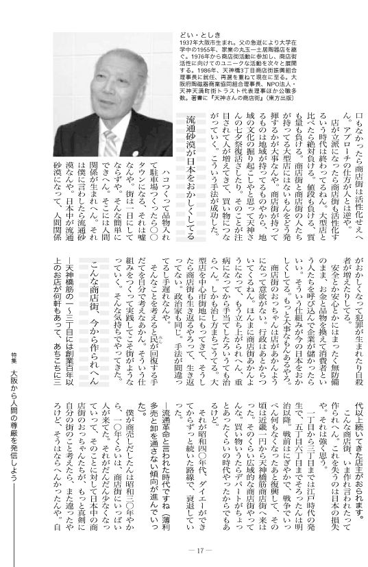 ◎「おおさかの街」70号特集 大阪から人間の尊厳を発信しよう 「街商人やからできること」天神橋三丁目商店街理事長 土居年樹