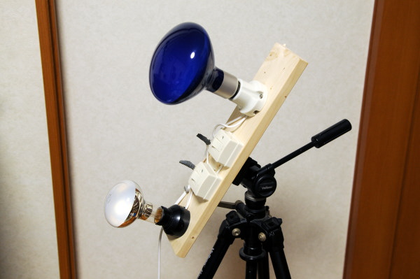 | これに気をよくし、さらに改良をすることにしました。それは光源です。写真電球は光の質(演色性)が良いのですが、かなり青に片寄った色合いです。特に我が家は電圧が高い(簡易テスターで107V)ので、電球メーカーの設計値よりも色温度が高く(青く)なっています。もう少し赤が欲しいところです。それから、この写真電球は既に生産中止ですが、保証寿命が短い(100時間程度)んです。すでに5時間くらいは使っていると思います。また、消費電力が大きい(500W)こともあり、必要時以外は消したいところです。しかし、頻繁な入り切りは電球の寿命を短くする恐れがあります。また、光として安定するまでに点灯から1分程度は待つ必要があります。そこで、妙なものを作りました。直並列切り替え装置とでも言えばいいでしょうか。写真用電球を長持ちさせるための工夫です。 |