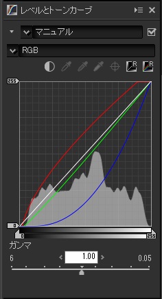 | 以下画像は全てコンデジで撮ったものです。違いは光源です。左から白熱電球、写真電球、白熱球+写真電球です。その他の撮影条件は共通(WB:太陽光、ISO:100、露出:オート、手ぶれ補正:なし)です。全く色が違うことが分かると思います。写真用電球があまりに青いのが困ったものです。ミックス光がオリジナルに一番近い色合いですが、それでも補正は必要です。2段目の画像がそれぞれの補正画像です。もっと適正なポイントはあるかと思います(特に白熱球)が、鑑賞に堪えられるレベルまで色補正されました。3段目が補正時のトーングラフです。これら3つを比べた場合、ミックス光を光源にした場合、補正量が小さいことが分かるかと思います。ミックス光は理想的な光源に近いと言えます。また当然ですが、白熱球と写真電球の補正パラメータが互いに逆になっていることも確認ください。 |
