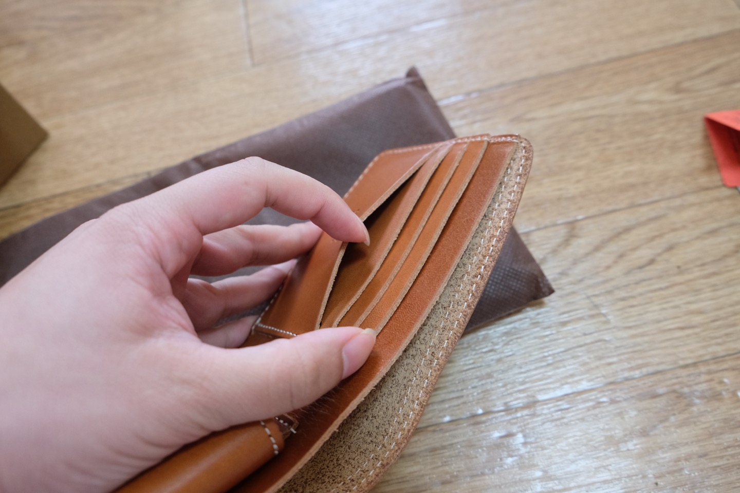 革の厚みがお判りでしょうか?かなりしっかりとしたお財布です。オールレザーで布の部分はステッチ以外一切ありません。
