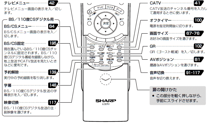 | LC-32E9 / LC-40E9 ■主な違い 不足ボタン「おはようタイマー」(操作可能「ツール」→タイマー機能→おはようタイマー) 位置変更「画面サイズ」「静止」「テレビ/データ」 余るボタン「常連番組」「インターネット」「VOD操作」「2画面」「操作切替」 |