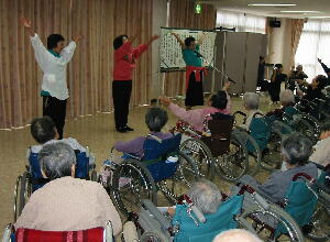 | 10月30日(日)、みみずくの 会さんによる「手話コーラス」 が開催されました。 今回は、お年寄りからリク エストのあった、昔なつかし い曲を手話で見せてくれまし た。 ボランティアさんの手話 に、導かれるように、手が自 然に動き出す姿やマイクを 握りしめ、美しい歌声を披露 される参加者もみられまし た。 アンコールの連続で予定 時間を越えてしまった程で す。 みみずくの会の皆さん、あ りがとうございました。また来 てくださいね。 |