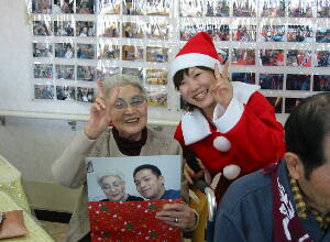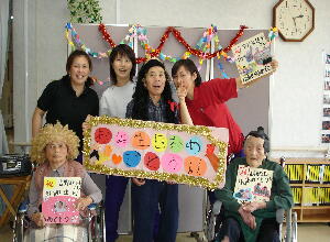 | 一年ぶりに、クリスさんの歌 声が、聞けると、この日は朝 からソワソワ(*^。^*) お昼を食べ、早々広場へ集 合!マイクの準備が出来る と、クリスさんが来る前に発声 練習!と、そこへ「クリスさん 登場です!」の声が!「待って ましたぁ〜!」と大歓声!セク シーな衣装に、男性陣はドキ ドキ?衣装チェンジと、クリスさ んがサンタガールに?一緒に 来てくださったドナルドさんも、 サンタに変身!(゜o゜) 一足早い、クリスマスを、あじ わちゃいました?最後は、お年 寄りのリクエストと「川の流れ のように」を歌ってくださり「一 緒に歌いましょう」とマイクを 向けられ発声の発揮どころ と、熱唱しました。 忙しい中、和光苑の皆さん に、会いたいと来てくださり、 一人一人に、握手をし声を掛 けてくださり、大感激の一日で す( ^3^)/ クリスさんより 平成18年1月14日(土)1 0:30〜 「千葉テレビ」にでます、見 てくださいね!!