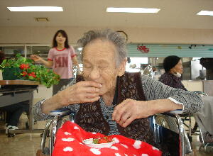 | 5月24日のよく晴れた水曜 日、茂原市にある姉妹施設 の「もばら和光苑」へ大勢の 入居者が遊びに行って来ま した(*^_^*)。 当苑のお年寄りと職員は 「どんな人がいるのかな 〜?!」とワクワク♪ドキド キ♪しながら、一ヶ月ほど前 から計画していました。 12時ちょうど、一列に長〜 く並べられたテーブルの上に は、おにぎり・焼きそば・ゴー ヤチャンプル・卵焼き・漬物・ フルーツポンチ等々が沢山 並べられ、いざ『バイキング 昼食』の始まりです(^◇^) 歩ける人はテーブルの前 まで行き、自分の食べたい 物を吟味し、好きなだけお皿 に盛っていました。 車椅子の人も職員に「あれ がイイ!これがイイ!!」 と、取ってもらってお皿からこ ぼれそうです(^_^;) いつもは食の細いお年より 達も、今日はここぞとばかり に、自分の好きな食べ物を 見つけて、食べたいだけ食 べていました。 全てを完食されると、みん な嬉しそうに「お腹いっぱい だよ!もう食べられない。」 と、腹鼓をたたいてとても満 足そうでした。 楽しい時間は、あっ!とい う間に終わり、お別れの時間 が来てしまいました。 「また来たいねぇ」と、お土産 のパウンドケーキを受け取 り、車までお見送りしてもら いました(T_T) 次回は、もばら和光苑の皆 さんが遊びに来てくれます♪ ♪ それまで、お元気でお過ごし くださいねッ? 私達も楽しみ にしていま〜す!! (^o^)v |