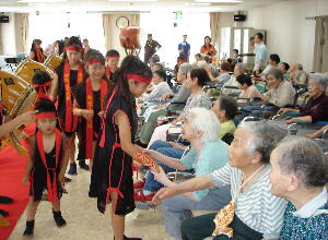 | 8月20日(日)にボランティ アさんによる「市原山火太鼓 公演」がありました。 子供から大人まで、た〜くさ んの方々が来てくれました。 最年少は、なんと3歳。しか しバチを握り、太鼓を叩く姿 は大人顔負けです。 演奏が始まると、苑内中に 響き渡るその音に、最初は ビックリしていたお年寄りで すが、しだいに慣れて来たよ うで、手拍子をしている方や 感動のあまり、目をうるませ ている入居者も。 演奏が終わると、子供たち がお年寄りの近くに来て、握 手会の始まりです(^_-) 普段苑内で、なかなか見か ける事のないチビッコたち。 あまりのかわいらしさに、頭 をなでたり「すごいね〜上手 だったよ。 いっぱい、練習したんだろ うね。」と声をかけたり。自分 のタオルで、汗をぬぐってあ げる方もいたくらいです。そ こには、いつにも増して、目 尻の下がった入居者の皆さ んがいたのでした。(^_-)-☆ |