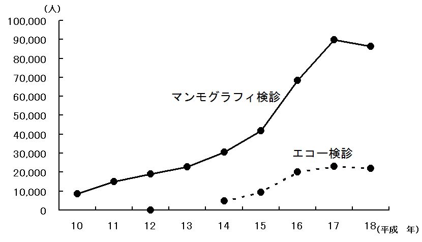 乳がん検診の増加・・・・右の表は千葉県がん検診センターが行っている乳がん検診の動向です。平成10年からマンモグラフィによる集団検診が開始されました。年々、受診者数は増えています。県別の受診者数では、千葉県は4年連続で日本一位です。またエコー(超音波)集団検診は平成14年から開始されました。マンモグラフィで写りにくい若年者の乳がんの発見に、大いに寄与しています。