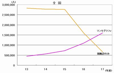 乳がん検診の推移・・・・右のグラフは平成13から17年度までの乳がん検診受診者数(全国)の推移を示したものです。視触診のみによる方法は平成15年度を境に全国的に減少しています。一方マンモグラフィ受診者数は年々増加し、平成17年度からは視触診の受診者数を超えました。千葉県では、マンモグラフィ検診もさることながら、若年者への超音波(エコー)検診も行われており、より精度の高い検診が実施されています。