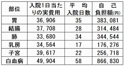 入院にかかる自己負担額・・・・平成19年度の社会医療診療行為別調査から、主要ながんについて、入院にかかる自己負担額を計算してみました(自己負担は3割で計算。また、保険外の差額ベッド等の費用は含みません)。乳がんについてみると、1日当たり検査・手術などを含め約3万5000円かかり、平均約17日間の入院が必要で、支払金額は約18万円と算出されます。これが高いのか安いのか、簡単には言えませんが、世界的に比較すると、自己負担額は少ない方だと思われます。