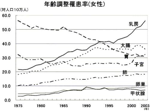 乳がんは増えている・・・・右のグラフは主ながんの罹患率の推移を示したものです(女性:1975〜2003年 国立がんセンターがん対策情報センターの資料)。15年ほど前から乳がんが一番多くなり、現在も増え続けていることが分かります。乳がんと大腸がんの予防には、肥満に注意することが大切だと言われています。また早期発見には、やはり定期的な検診が重要だと思います。
