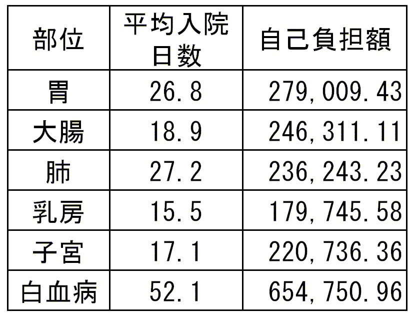 入院にかかる自己負担額・・・平成20年度の社会医療診療行為別調査から、主要ながんについて、入院にかかる自己負担額を計算してみました(自己負担は3割で計算。また、保険外の差額ベッド等の費用は含みません)。どのがんも入院日数は年々短くなって来ていますので、負担額も少なくなる傾向にあります。乳がんでは、入院が約15日で、自己負担額が約18万円となっています。