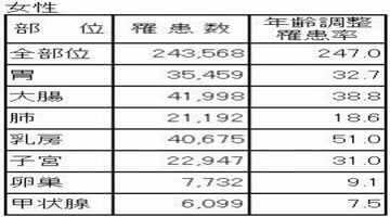 女性のがん罹患率・・・・右の表はがん対策情報センター(国立がんセンター)が発表したデータ(2001年)の抜粋です。女性の主ながんの人数とその割合を示しています。罹患率ではやはり乳がんが一番多く、次に大腸がん、胃がんと続きます。乳がんにかかる人は多いけれども、死亡率は決して高いわけではありません。乳がんは早期に発見してしっかり治療すれば助かるがんです。