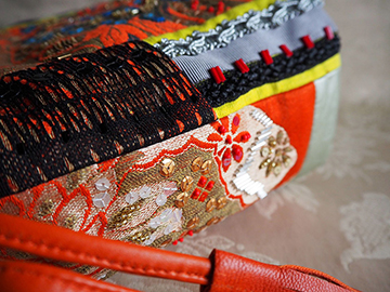 明治から江戸期のものと思われる朱色の帯、これまでもいくつかの作品で使用しました。