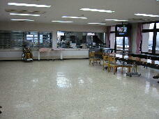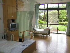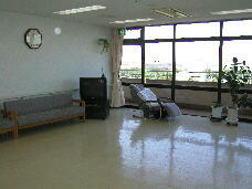 ひろびろとしたホールで、お年寄りと職員がゲームをしたり、お風呂に入ったり、時々?リハビリテーションもしています。