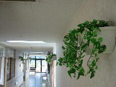 和光苑では、苑内の壁に沢山の「プランター」が掛けられています。このプランターは「アイビーガーランド」という、イギリスから持ち込まれた植物です。苑内のいたる所の壁に約100個も飾られていて、お年寄りに深緑の潤いを提供しています。
